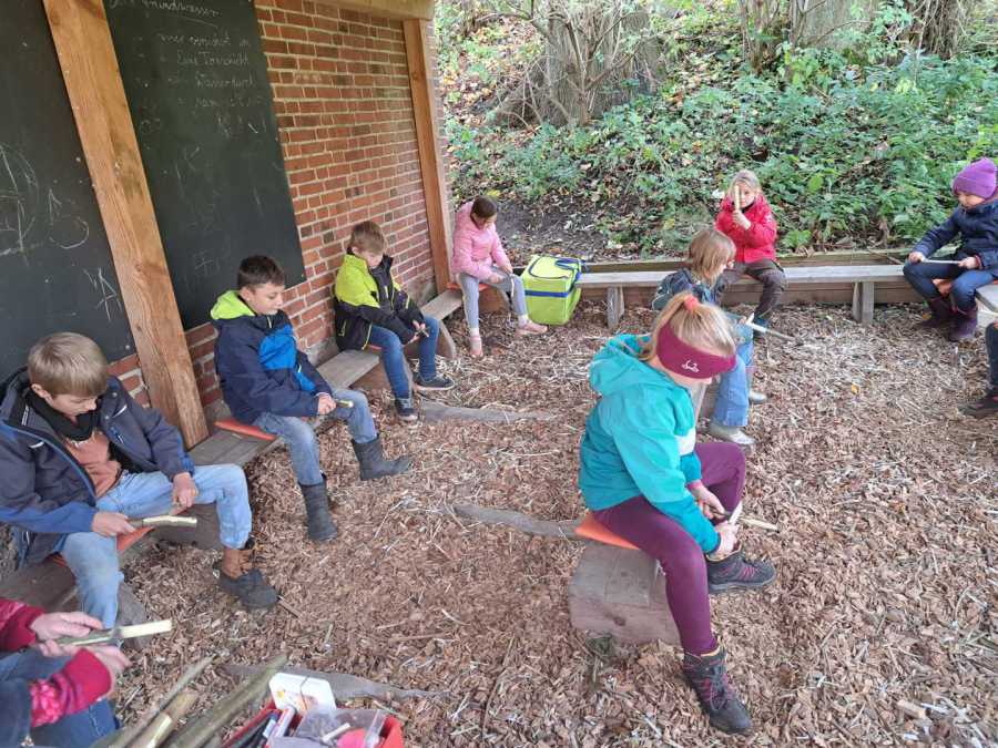 Im November 2025 haben alle Kinder unserer Schule bei Andrea Goose gelernt, wie man richtig und sicher schnitzt. An vier verschiedenen Tagen war Andrea bei uns und hat uns alles gezeigt. Wir haben im Draußenklassenzimmer auf den Holzbänken gesessen. Auf dem Boden waren Hackschnitzel, da konnten unsere Schnitzabfälle direkt liegen bleiben.